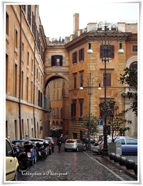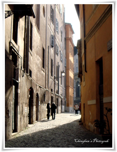個人認為,羅馬的街道很不好認,它的街道名是刻在一個坎在牆壁的石頭上,也或許是我們拿到了不好的地圖,在羅馬這幾天多走了不少冤枉路。但是迷失在這些巷弄之間,反而讓我發現了羅馬的另一種美。不知道為何我很喜歡這種感覺。陽光從兩個巷子間灑落在古代石路上,一陣陣的微風從面前吹了過來,也沒有多華麗的裝飾與顏色,心情很容易就陷入在浪漫的情境中。