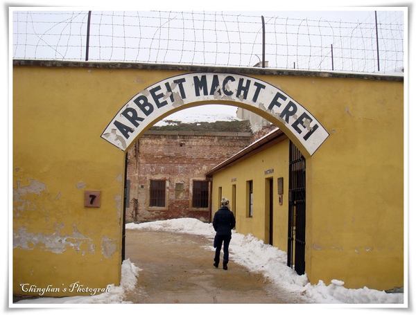 接這進入牢區前,就會看到每個集中營都會出現的大標題「勞動帶來自由」(“Arbeit macht frei”)的標誌。呼籲被迫害者要多多勞動,但是他們最後也沒得到自由。